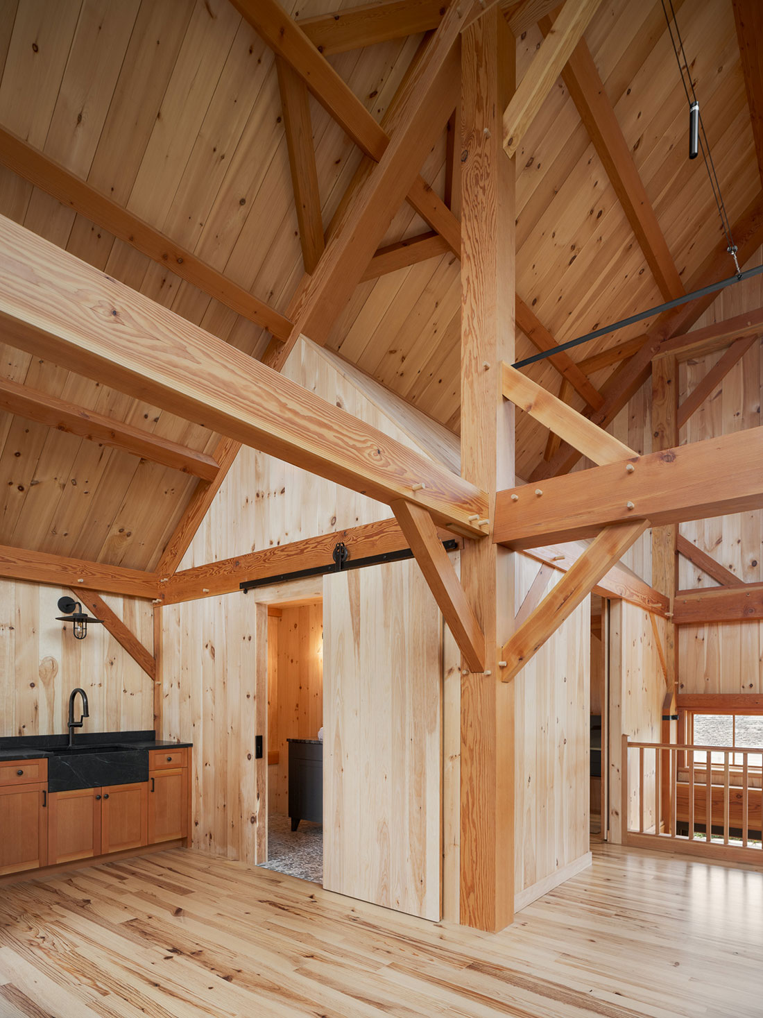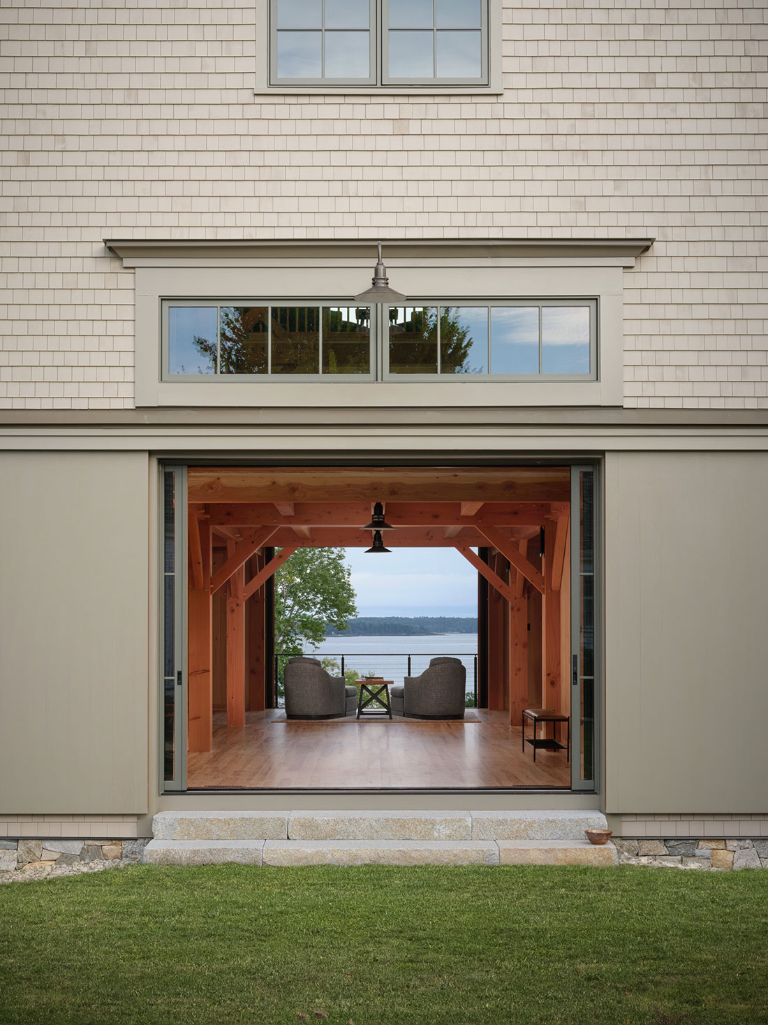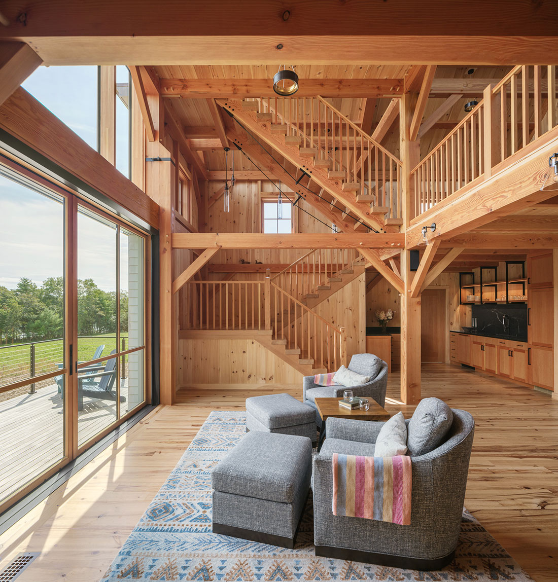 A ‘sea’ through view to ocean was created with traditional exterior sliding barn doors combined with interior large glass pocket doors on both gables. The beautiful hand cut Douglas-fir timber frame set the stage for curating the building’s material and colors selections, seamlessly blending tradition and modern design.