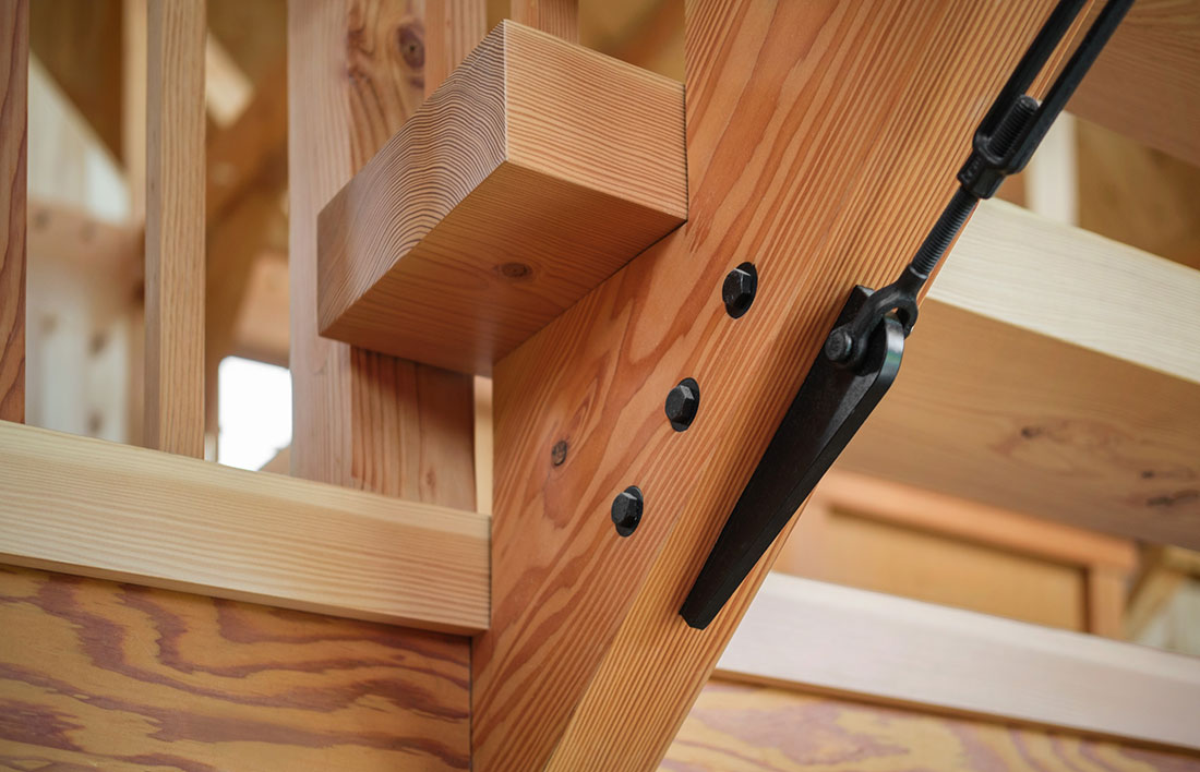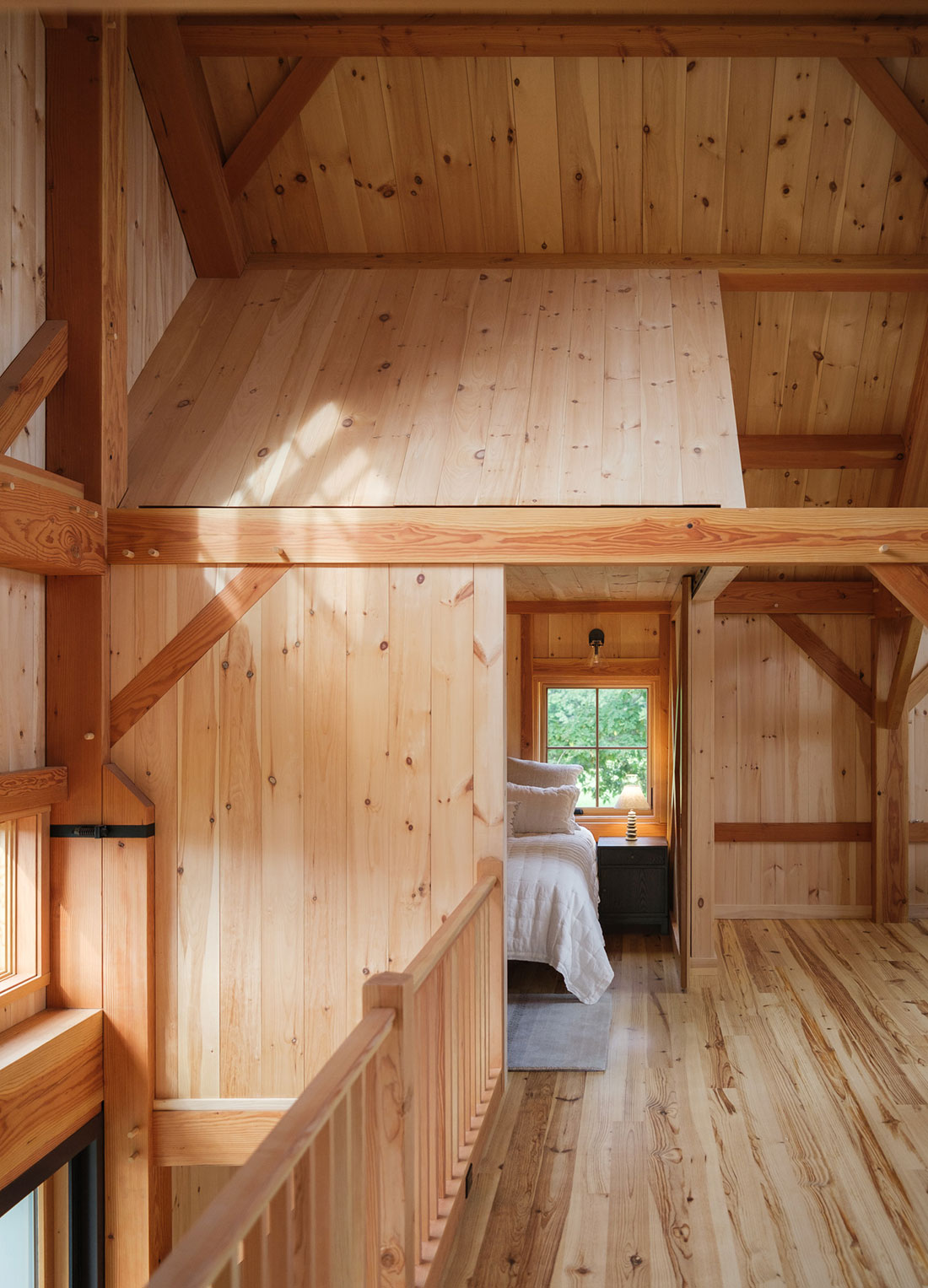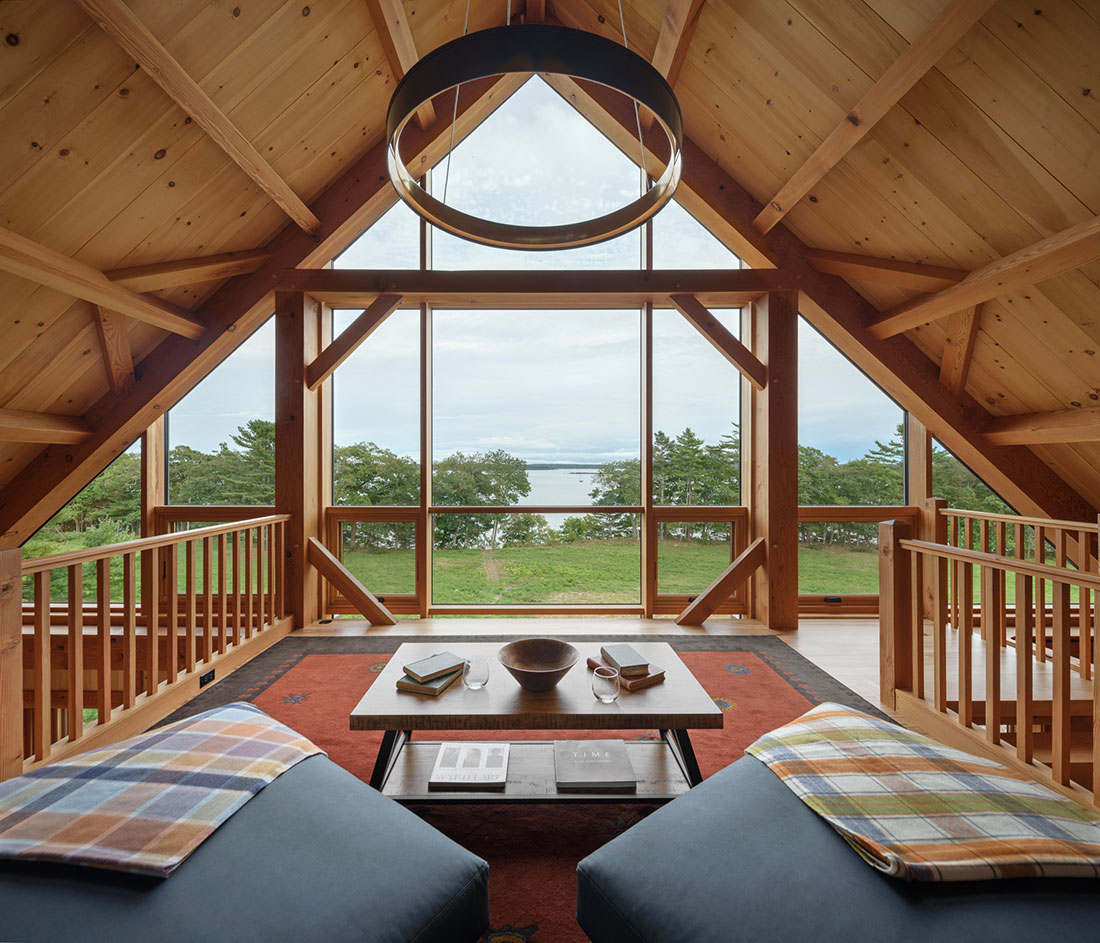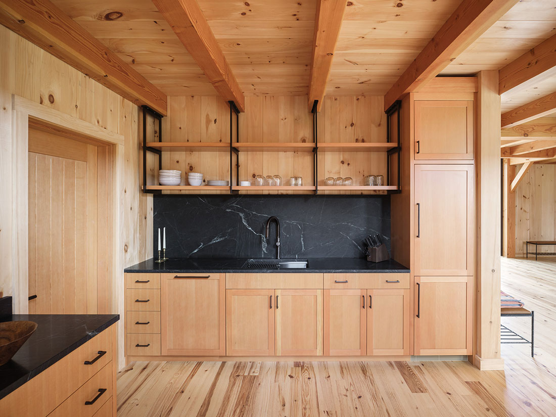 A ‘sea’ through view to ocean was created with traditional exterior sliding barn doors combined with interior large glass pocket doors on both gables. The beautiful hand cut Douglas-fir timber frame set the stage for curating the building’s material and colors selections, seamlessly blending tradition and modern design.