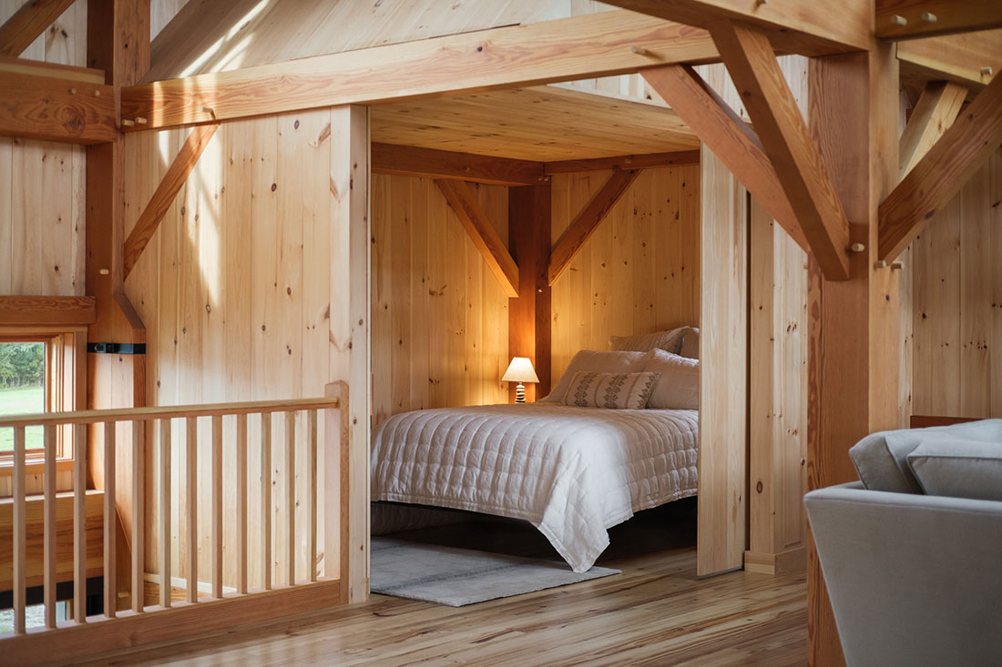 Our architect’s design enclosed the entire east gable in glass. A glazed timber curtainwall was selected to visually coordinate with the barn’s primary timber frame structure. The resulting transparency provides striking views from both within and without. During the day the internal spaces are filled with natural light and in the evening the timber structure and wood surfaces are on display as the barn becomes a glowing lantern hovering over the field.